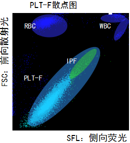 XN系列中A1、B1、B2这三款机型均含有低值血小板通道(PLT-F),此通道可解决以上除血小板聚集以外的异常因素影响的血小板计数假性增加或降低。在PLT-F通道中,Fluorocell PLT中的荧光染料对由CELLPACK DFL处理的血小板进行特异性染色、并且计数,根据前向散射光(体积大小)和荧光强度(核酸含量)的差异,明确的区分血小板和其他的血细胞,并且将荧光强度较强的区域划分为IPF(未成熟血小板比率)。