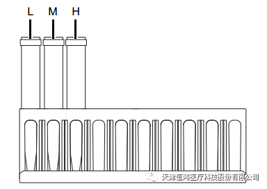 请以左起为比重校正液L、 M、 H的顺序将试管插入试管架。